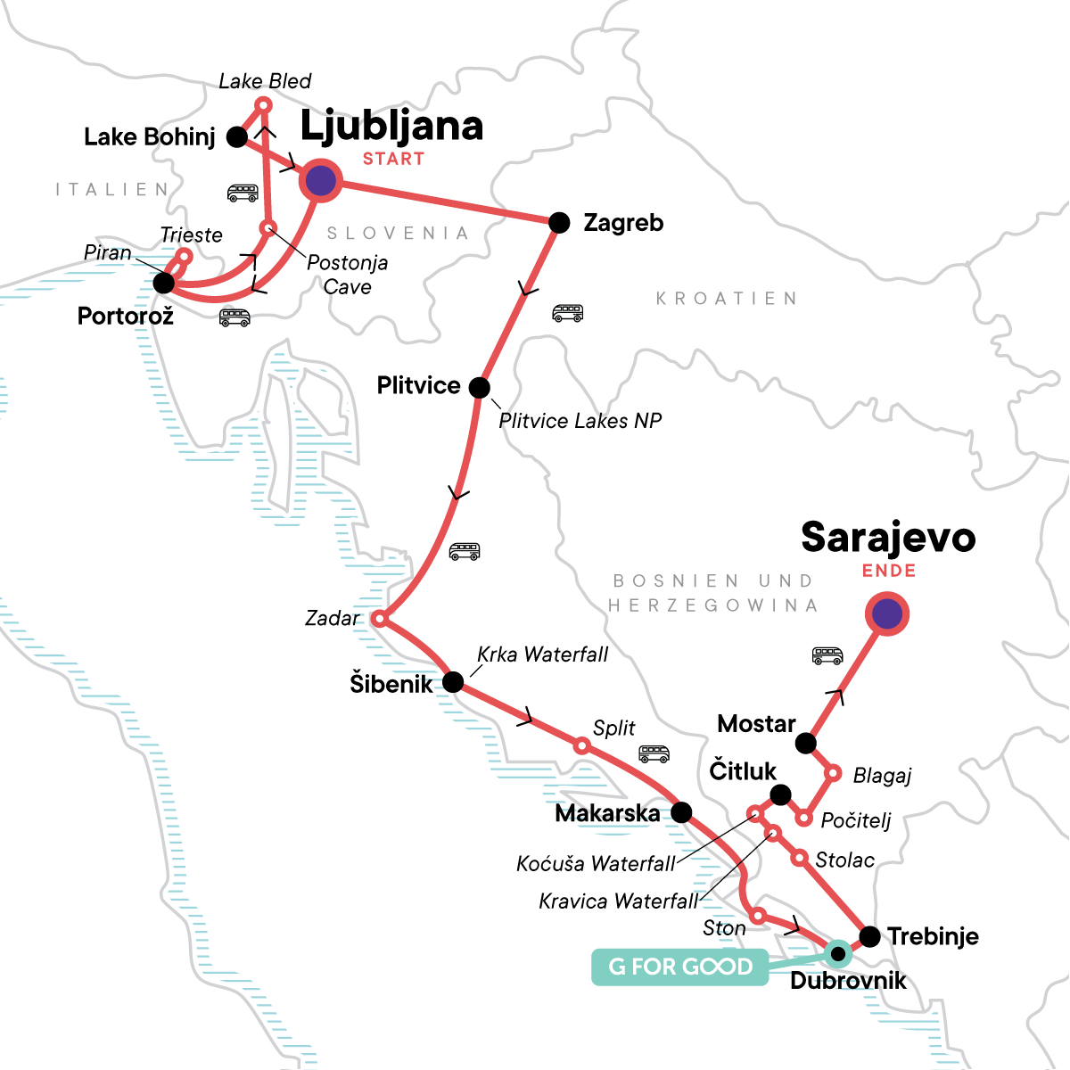 Hit the road from Ljubljana to Sarajevo with a crew of like-minded adventurers and dive into the best that Slovenia, Croatia, and Bosnia and Herzegovina have to offer. Take scenic walks through lush national parks with jaw-dropping lakes and waterfalls, explore historic landmarks that tell centuries of stories, and savour every bite of the local gastronomy. From stunning nature to rich culture, this 21-day journey across three incredible countries will leave you with endless memories and a heart full of adventure.